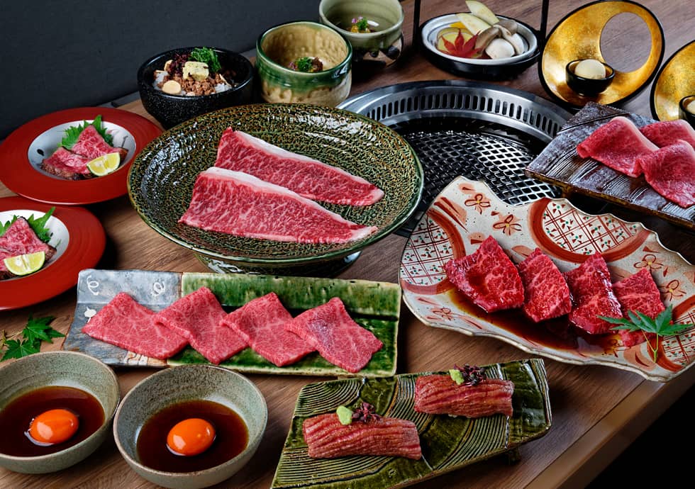 Appetizer of the day | Assorted Grilled Vegetables | Seared Matsusaka Beef cuts served with condiment | Broiled Matsusaka Beef marbled cut sushi | Premium selection of Matsusaka Beef cuts with salt | Premium selection of Matsusaka Beef cuts with our Chef’s sauce | Premium selection of Matsusaka Beef Yakishabu with ponzu sauce | Steak of the day | Sliced Matsusaka Beef served with Sukiyaki-style sauce | Hot stone pot Matsusaka Beef garlic rice | Today’s Dessert